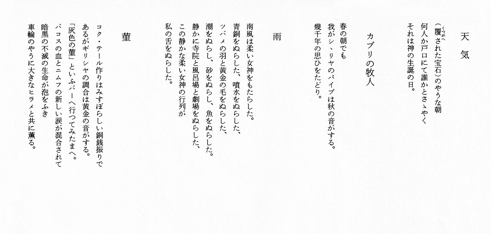 関口憲二の“光陰謳歌”76 2024.05.232026.02.20最新の投稿2026.02.20詩句を読むギリシア的抒情詩(西脇順三郎)『Ambarvalia』ギリシア的抒情詩/「西脇順三郎詩集」(岩波文庫)2026.02.18写真俳句墓石に・・・墓石に 蝶とまりきて 波しずかAyumi.Iいいですね。静と静が、きれいに重なっています。 蝶は生の象徴、墓石は死の象徴。その間に波音があるはずなのに「しずか」...2026.02.13えこりんのメダカビオトープメダカ池をつくる_20262026-02-04ベランダで大変なことが起きていた。メダカのタライ池が水漏れしている。水はだいぶ残っていたので慌てることはなかったけれど、このままにしておくこ...【気ままに心字池】心字池雑記、WordPress、Mac・iPad、【7階のオアシス】グリーンライフ、テラスの“Skyart”、小さな訪問者【えこりんのメダカビオトープ】ベランダビオトープ、室内水槽、メダカ、水草、石巻貝、産卵床【旅の気分で(写真散歩)】南流山ぐるり写真散歩、少し遠くへ、古き旅の栞&絵はがき関口憲二の“Photo Poem Ttrunk”趣味の個人ブログです。〜 AIと写真を語る、写真俳句、詩句を読む 〜