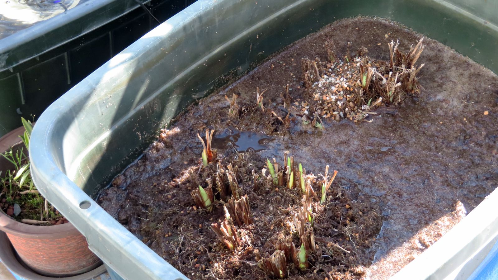 ベランダは春へ Photo-diary 2026.03.11 まだ寒く冷たい風が吹いている。それでも時が来ればアセビ(馬酔木)の花が咲いている。メダカがいるスイレン池の、芽が出るか心配だったスイレンの葉も出始めている。花菖蒲も新芽を覗かせたので、今日は花菖蒲池作りに着手し、鉢から出して直に植え替えた。このあとは心字池からもう一塊移し替える予定でいる。今年はメダカを入れないつもりだけど・・・